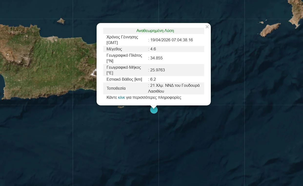 Σύμφωνα με την προκαταρκτική εκτίμηση του Εθνικού Αστεροσκοπείου Αθηνών, ο σεισμός είχε μέγεθος 4,6 βαθμών της Κλίμακας Ρίχτερ, με το επίκεντρο να εντοπίζεται 21 χλμ Ν/ΝΔ του Γουδουρά στο Λασίθι.