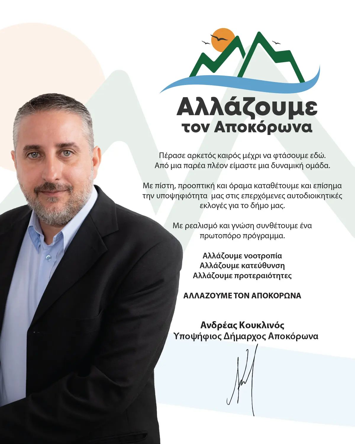 Μετά το νυν δήμαρχο, κ. Χαράλαμπο Κουκιανάκη – ο οποίος από πολύ νωρίς έχει δηλώσει πως θα διεκδικήσει μια ακόμη θητεία – και τον Περιφερειακό Σύμβουλο κ. Κώστα Γύπαρη, που την περασμένη Τετάρτη ανακοίνωσε την υποψηφιότητα του, μια ακόμη υποψηφιότητα, αυτή του περιφερειακού συμβούλου, κ. Ανδρέα Κουκλινού, έγινε γνωστή νωρίτερα το απόγευμα της Πέμπτης.