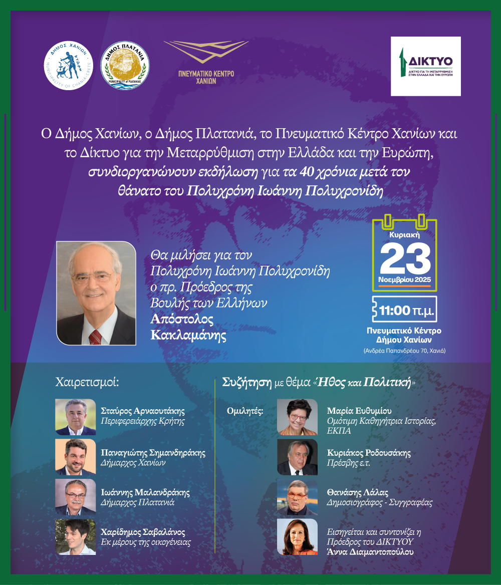 Ο Δήμος Χανίων, ο Δήμος Πλατανιά, το Πνευματικό Κέντρο Χανίων και το Δίκτυο για τη Μεταρρύθμιση στην Ελλάδα και την Ευρώπη συνδιοργανώνουν εκδήλωση για τα 40 χρόνια μετά τον θάνατο του Πολυχρόνη Ιωάννη Πολυχρονίδη, την Κυριακή 23 Νοεμβρίου 2025, ώρα 11.00 π.μ., στο Πνευματικό Κέντρο Χανίων.