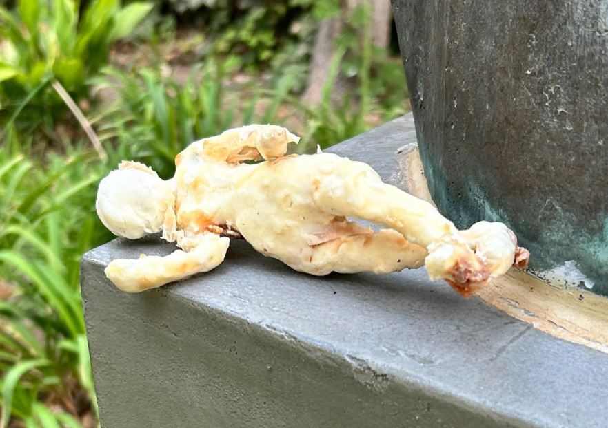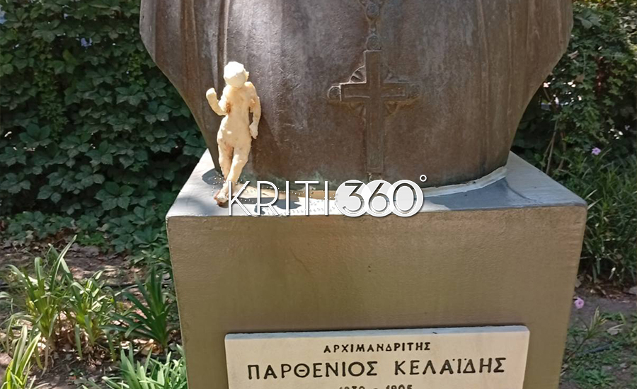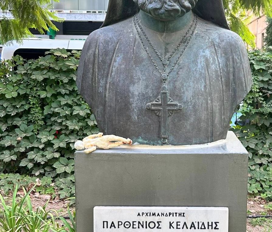 Ένα αγαλματίδιο, ξεκάθαρα σε σχήμα ανθρώπινης φιγούρας, με σημάδια από αίμα πάνω του βρισκόταν παρατημένο στην προτομή του Παρθενίου Κελαϊδή.