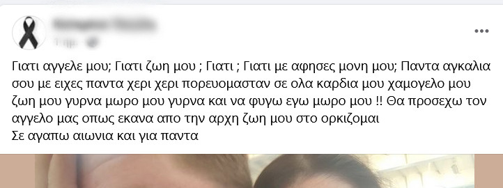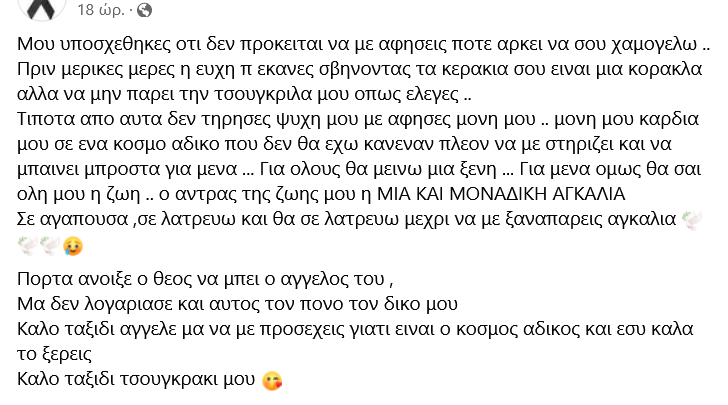 Σπαρακτικά ειναι την ίδια ώρα τα λόγια της γυναίκας της ζωής του στα κοινωνικά δίκτυα. Σε ανάρτηση της στο Facebook, η αγαπημένη του ραγίζει καρδιές αναφέροντας: