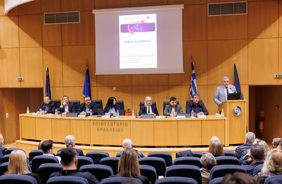 Με μεγάλη συμμετοχή και έντονο ενδιαφέρον από την επιχειρηματική κοινότητα πραγματοποιήθηκε τη Δευτέρα 27 Απριλίου 2026, στην Αίθουσα «Καστελλάκη» του Επιμελητηρίου Ηρακλείου, η ημερίδα με θέμα: «Κυβερνοασφάλεια των Μικρομεσαίων Επιχειρήσεων στην εποχή της Οδηγίας NIS2».