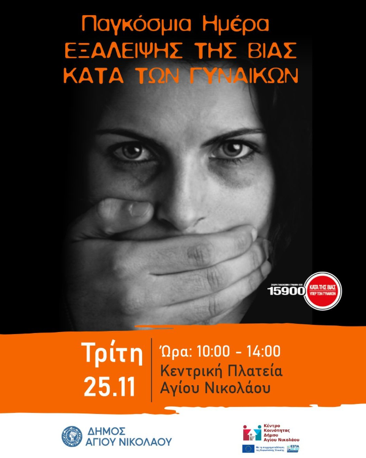 Με αφορμή την Παγκόσμια Ημέρα για την Εξάλειψη της Βίας κατά των Γυναικών (25 Νοεμβρίου), το Τμήμα Κοινωνικής Προστασίας και Παιδείας και το Κέντρο Κοινότητας Δήμου Αγίου Νικολάου διοργανώνουν δράσεις ενημέρωσης και ευαισθητοποίησης του κοινού στις 21-24-25/11 & 3-4/12/ 2025.