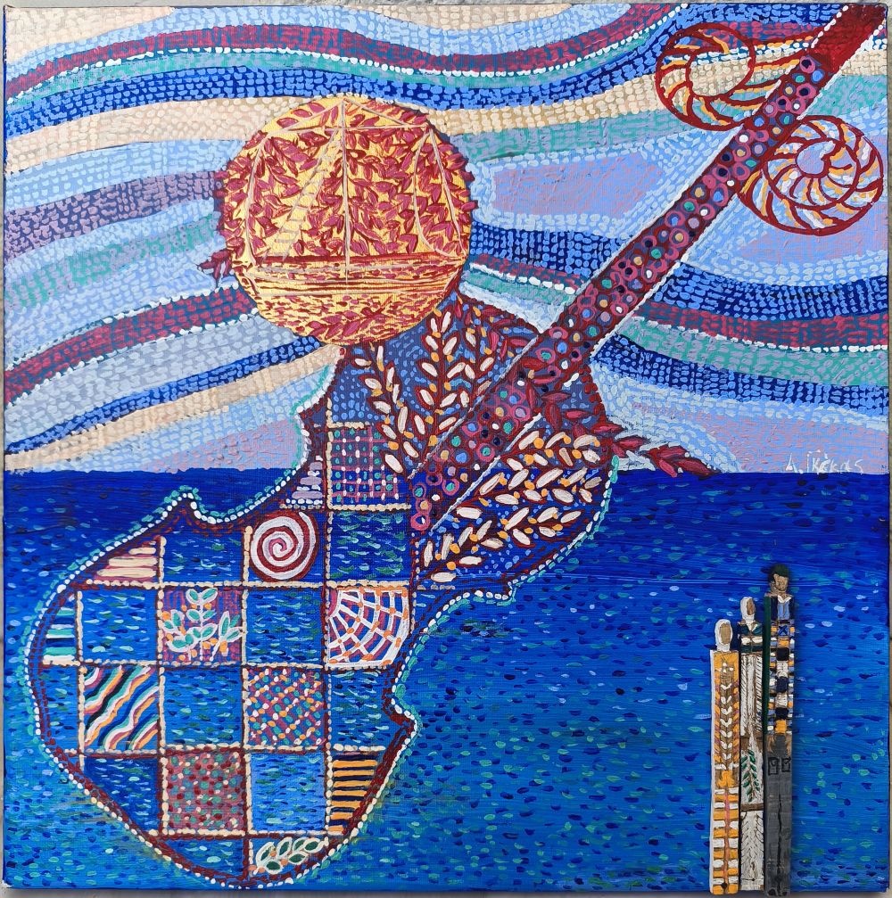 Ο καταξιωμένος ζωγράφος προσέφερε έργο αφιερωμένο στον Στρατή Καλογερίδη, ζωντανεύοντας μέσα από χρώματα και φιγούρες τη μουσική κληρονομιά του Μιραμπέλλου.