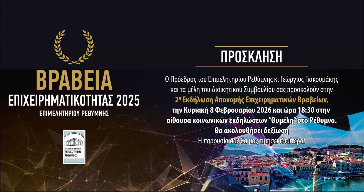 Το Επιμελητήριο Ρεθύμνης διοργανώνει τη 2η Εκδήλωση Απονομής Επιχειρηματικών Βραβείων, στο πλαίσιο των Βραβείων Επιχειρηματικότητας 2025, με στόχο την ανάδειξη και επιβράβευση της τοπικής επιχειρηματικής δραστηριότητας.