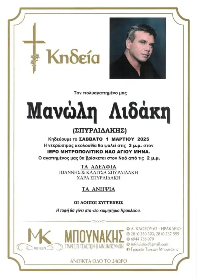 Υπενθυμίζεται ότι το Σάββατο 1η Μαρτίου, συγγενείς, φίλοι, συνεργάτες και θαυμαστές θα συγκεντρωθούν για να αποχαιρετήσουν τον αγαπητό τραγουδιστή Μανώλη Λιδάκη, ο οποίος έφυγε από τη ζωή σε ηλικία 64 ετών.