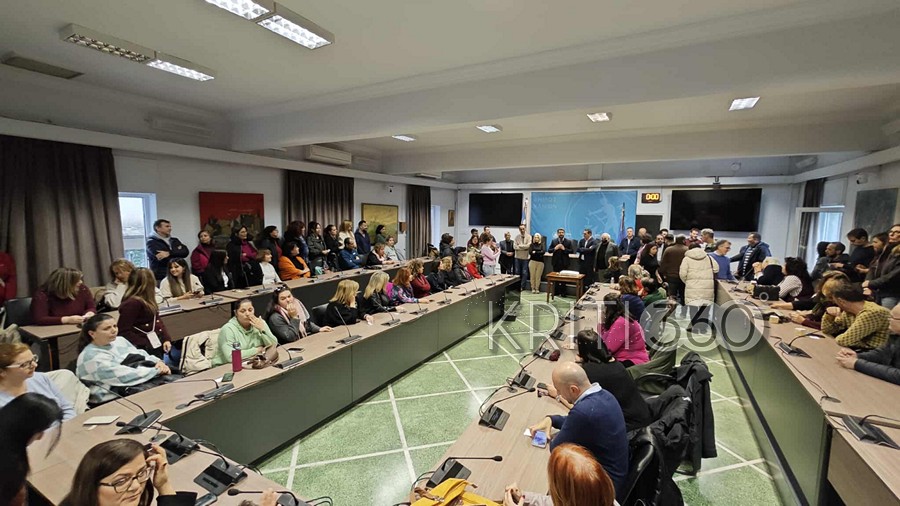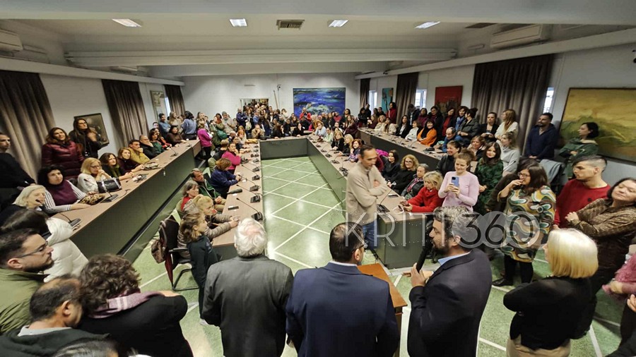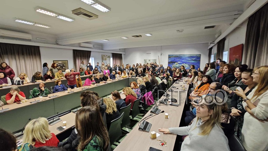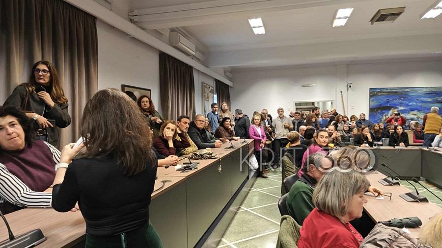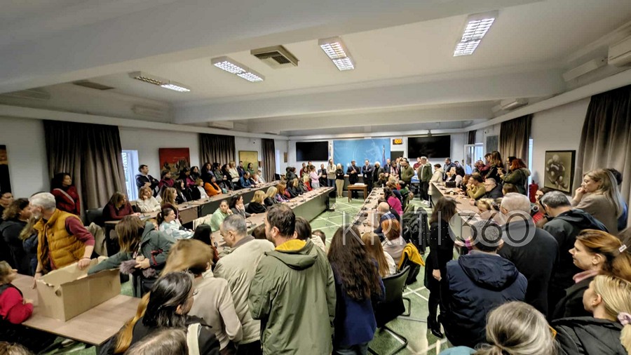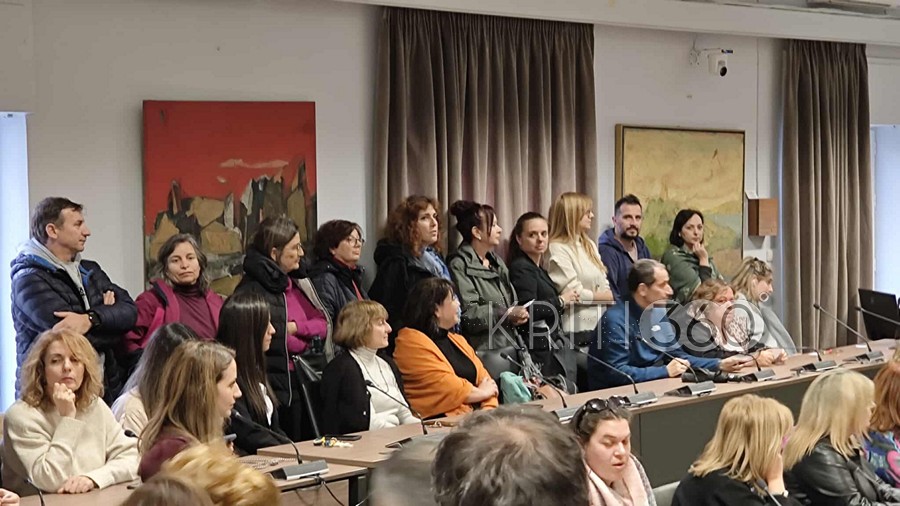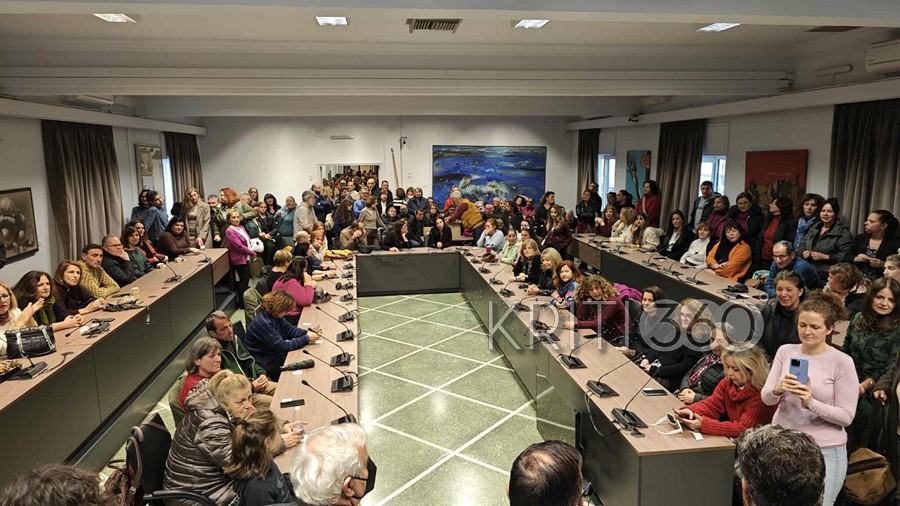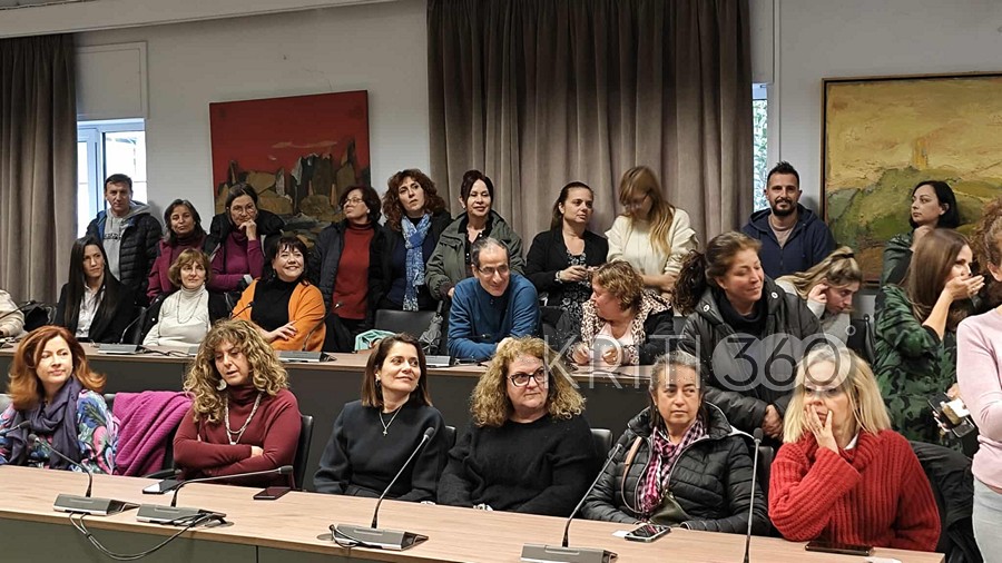 Πλήθος εργαζόμενων συγκεντρώθηκε στην αίθουσα του δημοτικού συμβουλίου, όπως επίσης στελέχη της δημοτικής αρχής και της μείζονος αντιπολίτευσης.