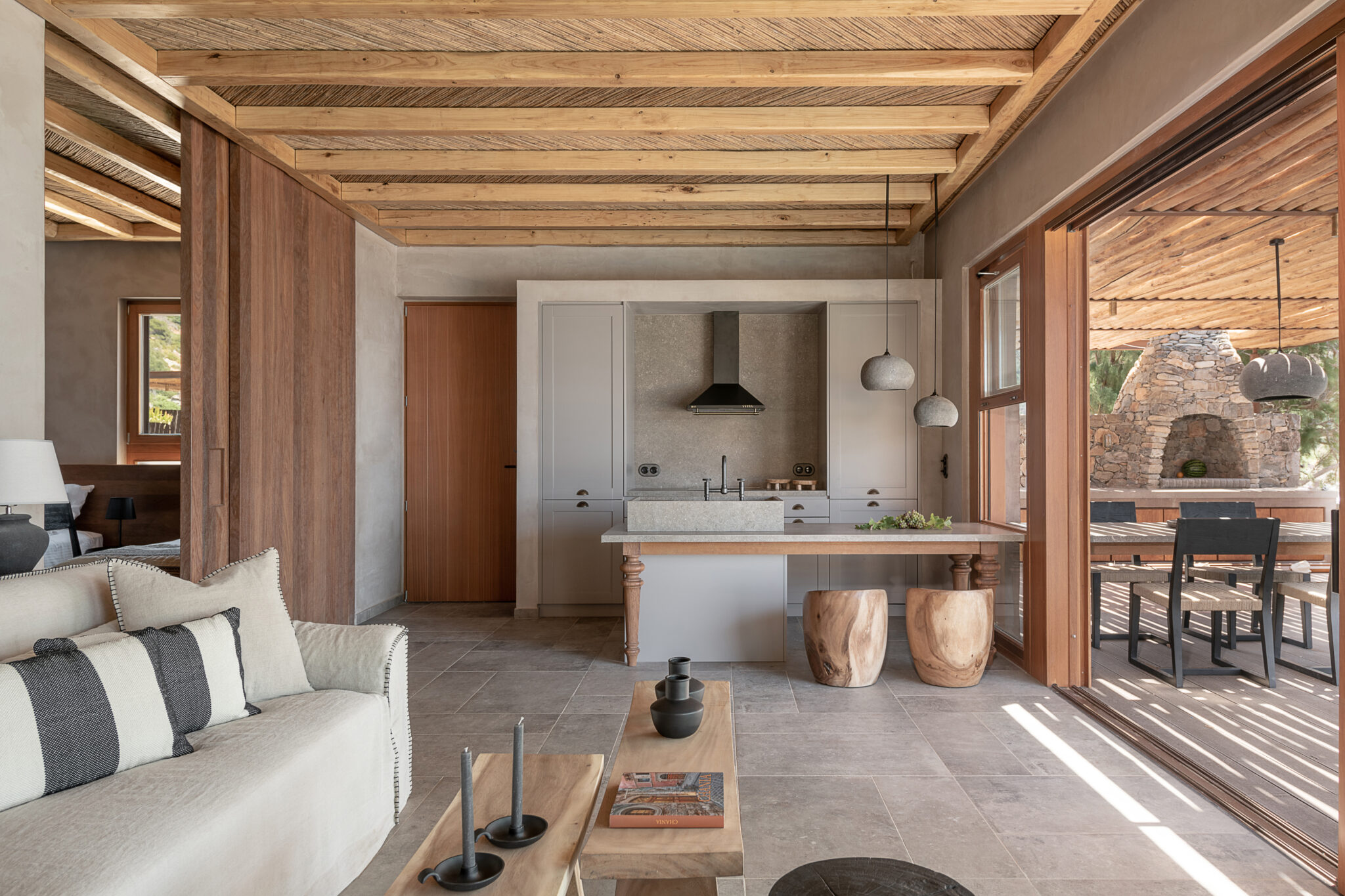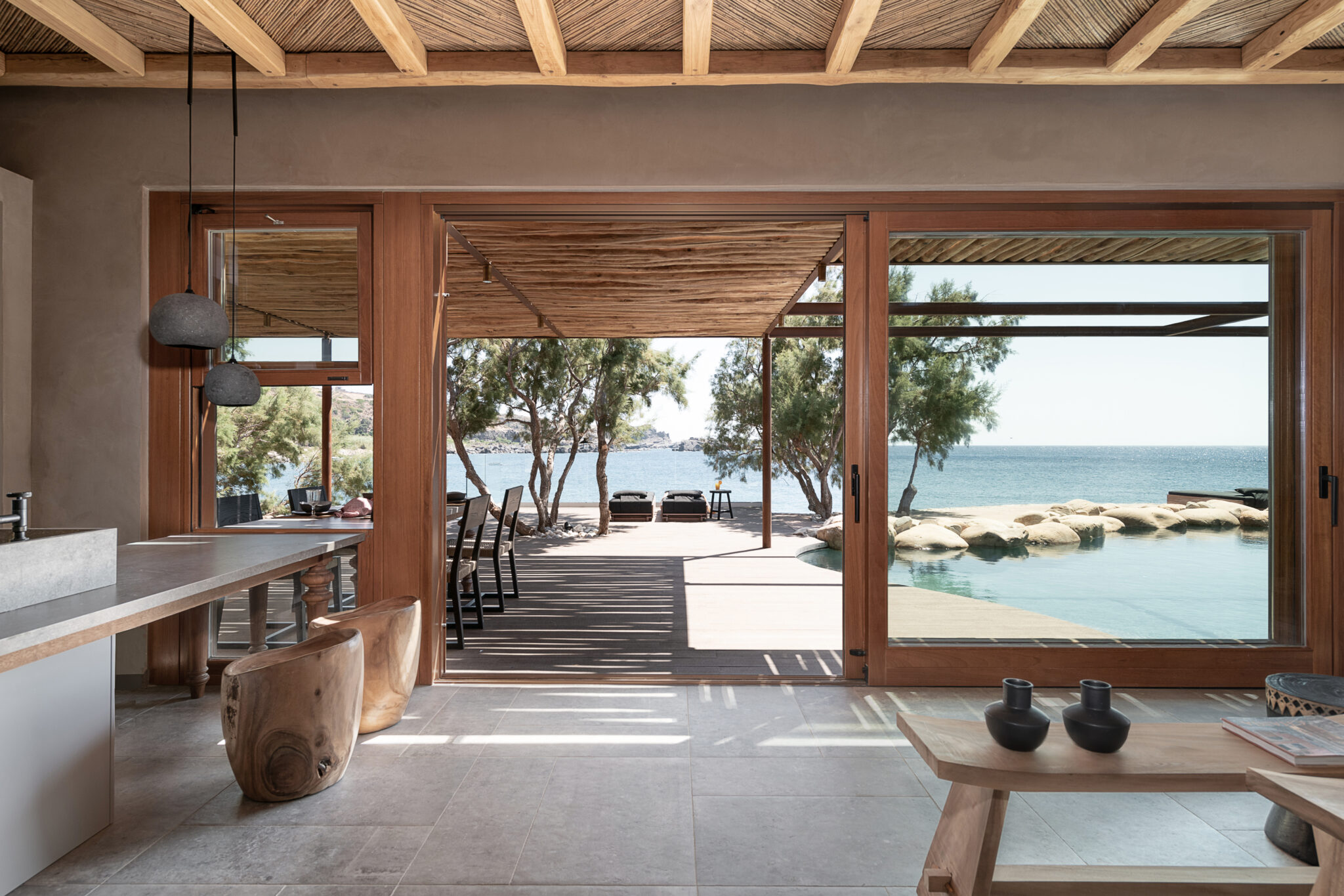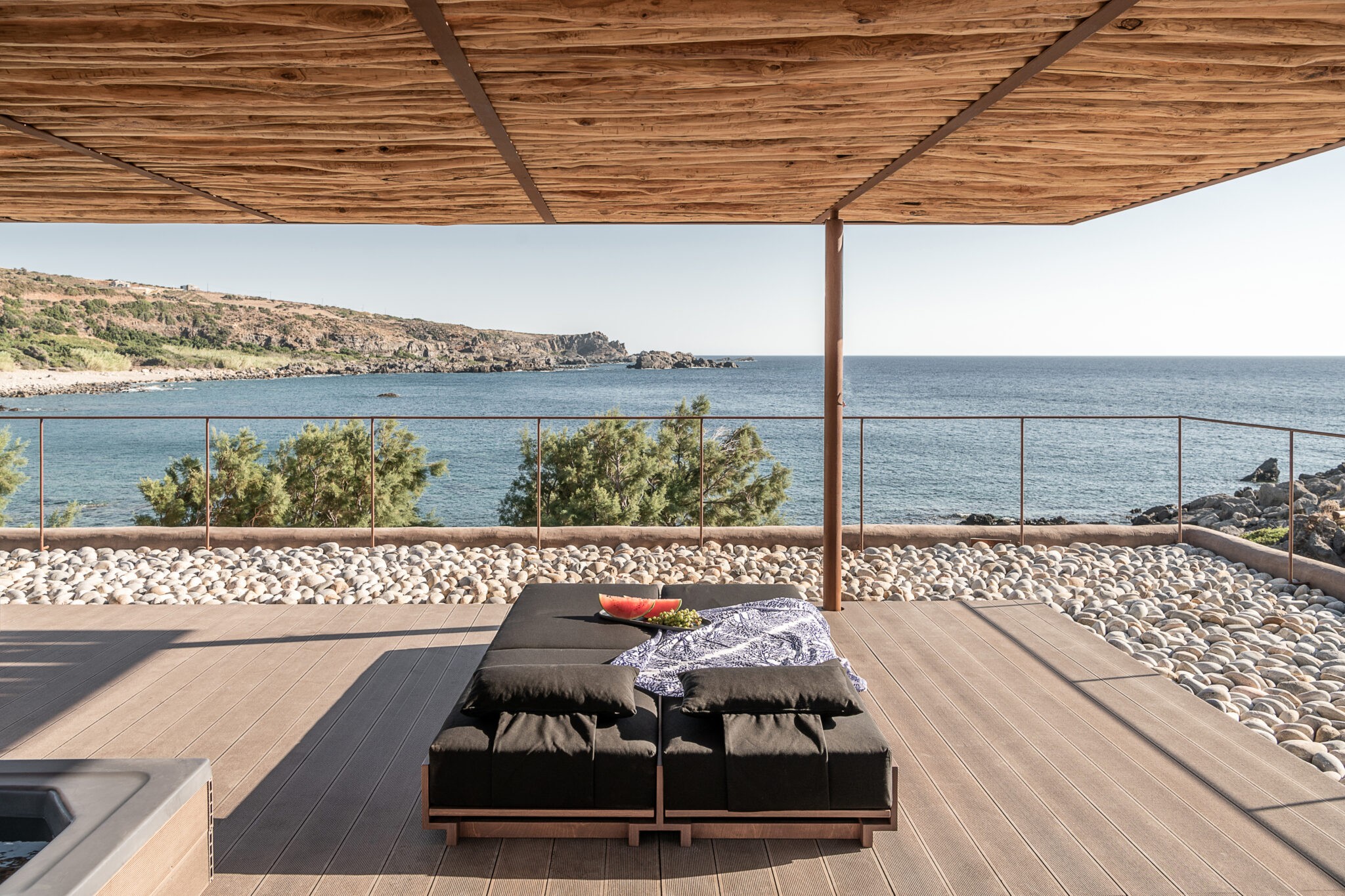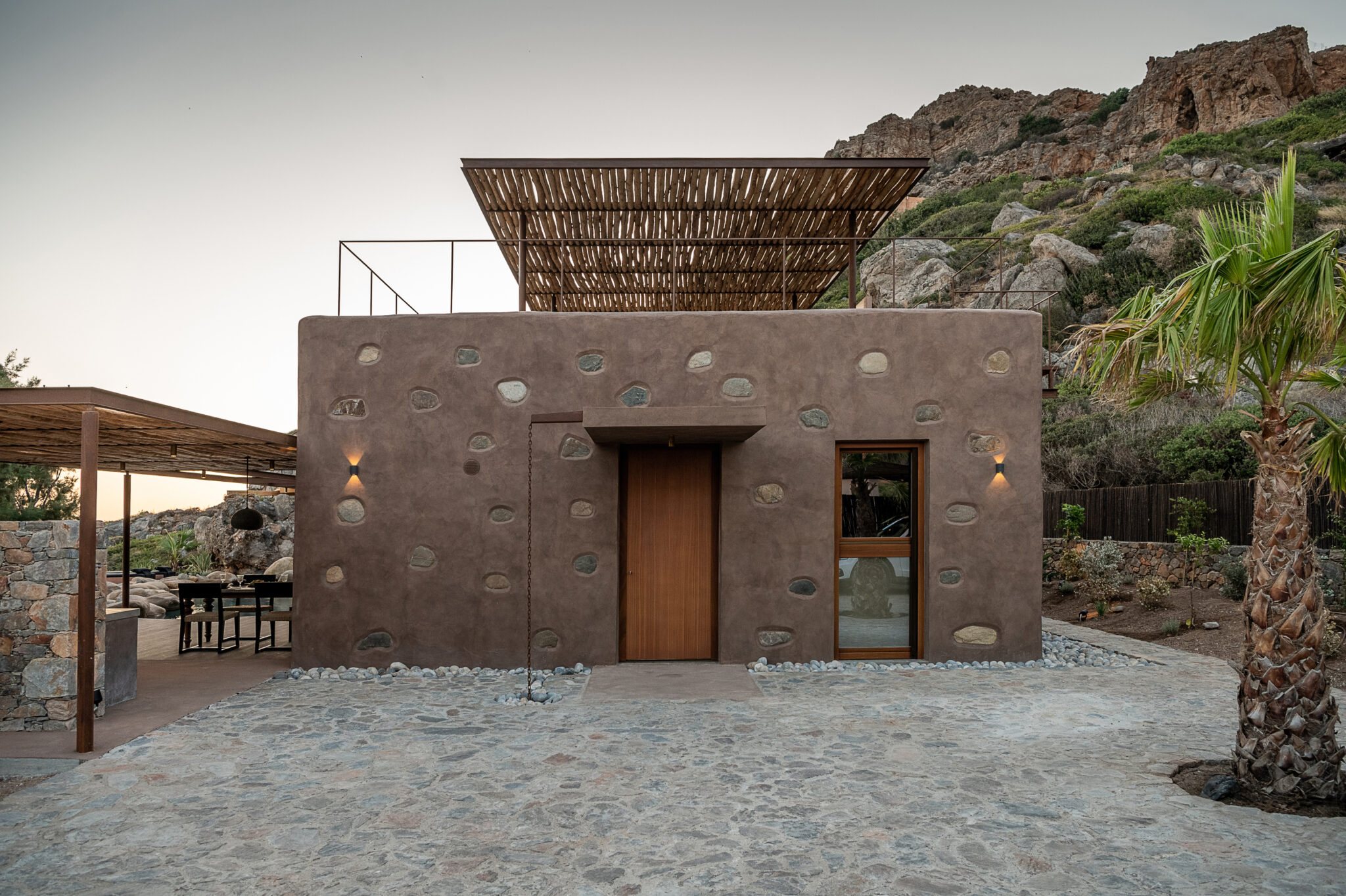 «Το εξωτερικό δάπεδο είναι φτιαγμένο από παραδοσιακό γυαλισμένο κονίαμα και ντόπια πέτρα. Ο πέτρινος υπαίθριος φούρνος-κουζίνα συνιστά το όριο του υπαίθριου καθιστικού, διαχωρίζοντάς τον από την κύρια είσοδο, και ολοκληρώνει τη σύνθεση. Ένα σαφές κατάστρωμα ορθογώνιου σχήματος ορίζει το εξωτερικό σαλόνι και καταλήγει σε μια πλατφόρμα πάνω από τη θάλασσα» σημειώνει η αρχιτεκτονική ομάδα.