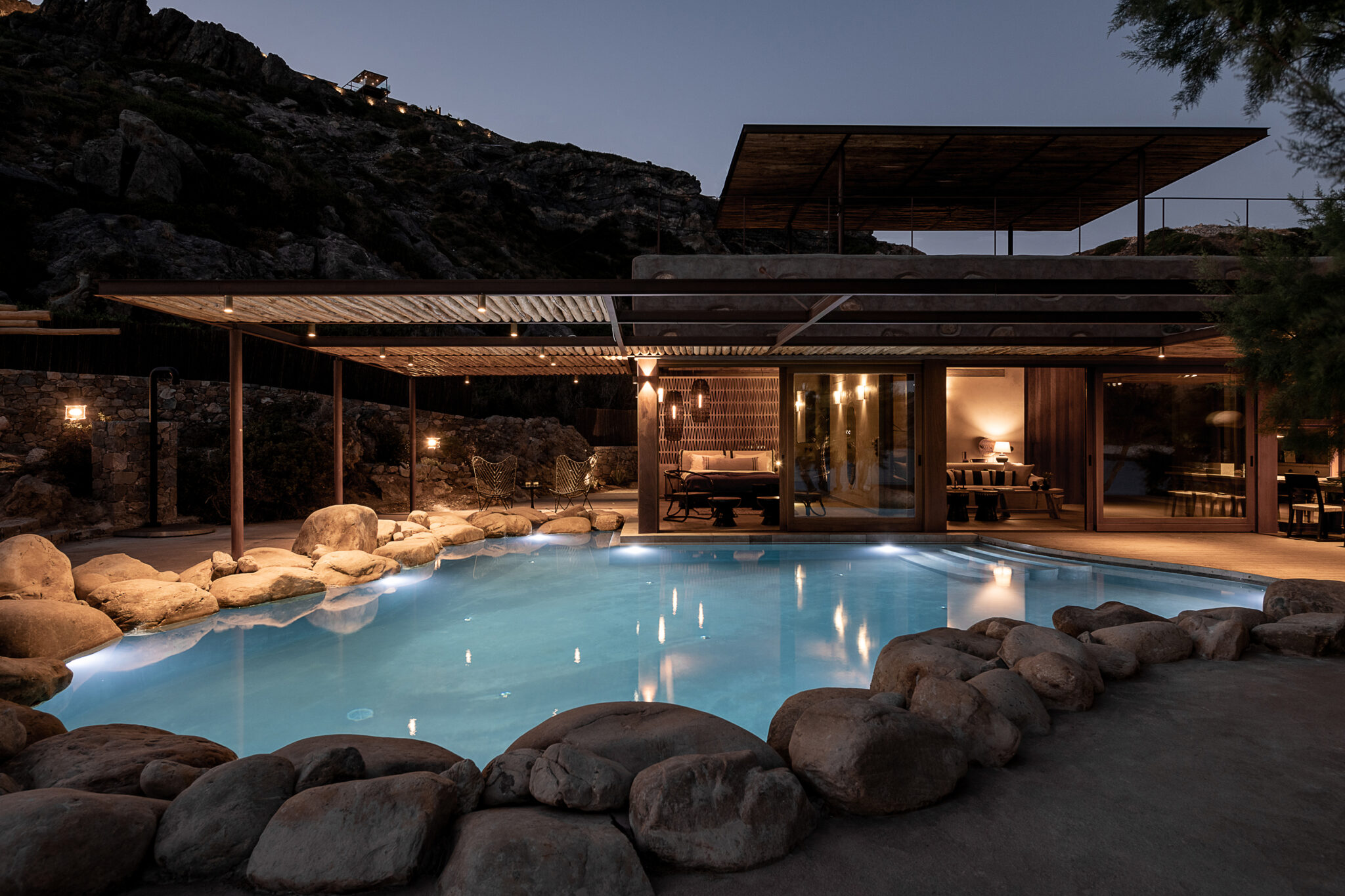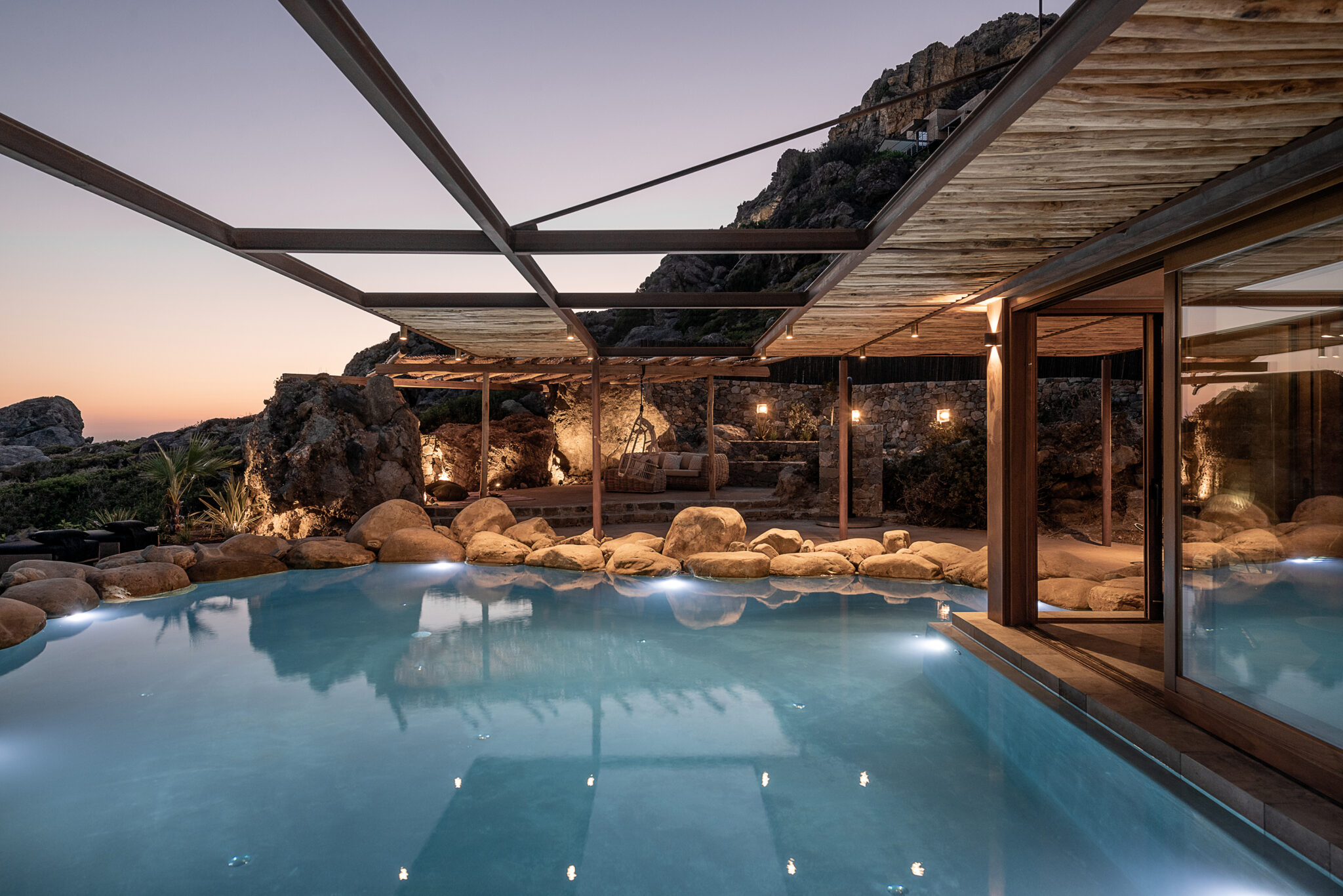 Το οικόπεδο περικλείεται από ντόπια φυσική πέτρα που συμβάλλει στην ενσωμάτωση της βίλας στο φυσικό περιβάλλον. Ο τεχνητός φωτισμός του σπιτιού δημιουργεί μια μοναδική ατμόσφαιρα με χαλαρωτικά vibes που δημιουργούν συνθήκες ευφορίας.