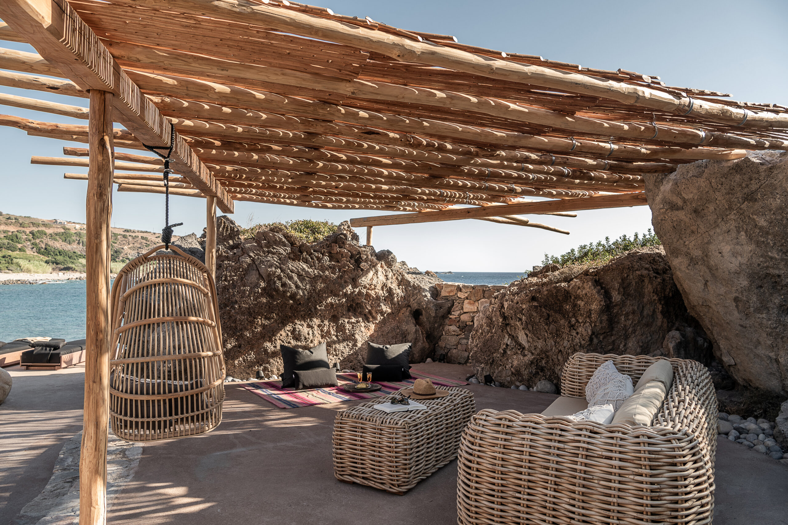 Τα έπιπλα στον εξωτερικό χώρο της βίλας γίνονται ένα με τα υλικά της φύσης και οι ώρες ανάπαυσης υμνούν το «slow living»: την τάση που προωθεί την απόλαυση της στιγμής με όλες τις αισθήσεις και τον αναζωογονητικά αργό ρυθμό με τον οποίο μπορούμε να βιώνουμε τη ζωή.