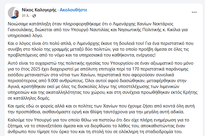 Σε ανάρτησή του ο Αντιπεριφερειάρχης Χανίων Νίκος Καλογερής υπερασπίζεται το έργο του κ. Γιανουλάκη και αφήνει αιχμές για όσους ενημέρωσαν τον Υπουργό, ζητώντας να επανεξετάσει άμεσα το θέμα και να διορθώσει το λάθος του.