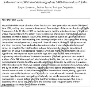 Σύμφωνα με τους επιστήμονες που συνέγραψαν την μελέτη, στην προσπάθειά τους να αναλύσουν τον κορωνοϊό ώστε να παρασκευάσουν ένα ασφαλές και αποτελεσματικό εμβόλιο, εντόπισαν «αποτυπώματα» που, όπως υποστηρίζουν οι ίδιοι, δείχνουν ότι ο ιός έχει εργαστηριακή προέλευση. Μάλιστα δηλώνουν ότι προσπάθησαν να δημοσιεύσουν τα ευρήματά τους, αλλά συνάντησαν την αντίδραση μεγάλων επιστημονικών περιοδικών, καθώς η κυρίαρχη άποψη ήταν ότι ο ιός έχει φυσική προέλευση.