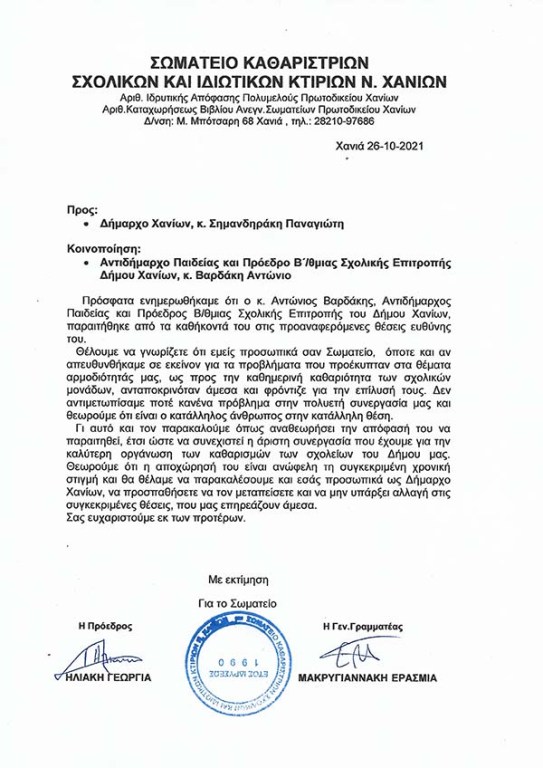 Αυτή την φορά, το Σωματείο Καθαριστριών Σχολικών και Ιδιωτικών Κτιρίων στα Χανιά, ζητά να μην γίνει δεκτή η παραίτηση του κ. Βαρδάκη από τον Δήμαρχο Χανίων ενώ καλεί και τον ίδιο τον Αντιδήμαρχο, να αναθεωρήσει την απόφαση του.