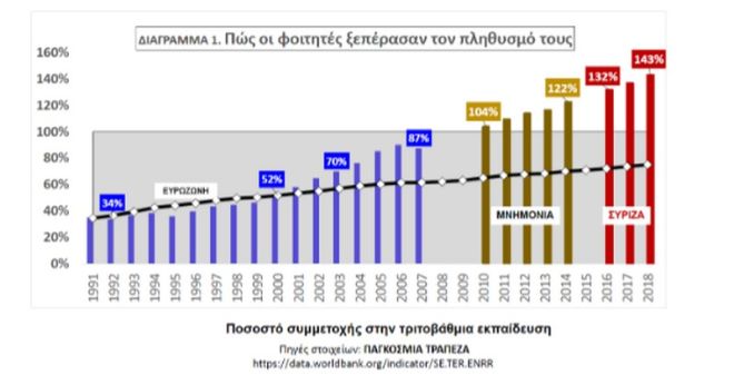 Πώς γίνεται αυτό; Δηλαδή πώς είναι δυνατόν να είναι στα πανεπιστήμια φοιτητές οι οποίοι αθροίζονται στο 104%, το 122%, το 132% και το 143% του αντίστοιχου πληθυσμού των ηλικιών που μπαίνουν στην Τριτοβάθμια Εκπαίδευση εκείνη την περίοδο; Αυτό φαίνεται απίστευτο! Πώς έχουμε φοιτητές πιο πολλούς από όσους έχουμε ως πραγματικό πληθυσμό; Μην αγχώνεστε, θα το εξηγήσουμε παρακάτω.