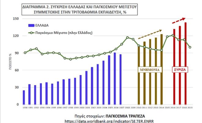 Ένα από τα επιτεύγματα για τα οποία μπορεί να επαίρεται μια χώρα στον παγκόσμιο χάρτη, είναι η συμμετοχή του αναλογούντος πληθυσμού 19-23 ετών στην Τριτοβάθμια Εκπαίδευση. Ο Δείκτης που εκφράζει πόση είναι αυτή η συμμετοχή κατασκευάζεται ως εξής: παίρνουμε τον πληθυσμό της χώρας στην κατηγορία 19-23 ετών και βρίσκουμε τι ποσοστό είναι εγγεγραμμένοι στην Τριτοβάθμια Εκπαίδευση. Όσο πιο υψηλός είναι ο σχετικός δείκτης, τόσο περισσότερη ικανότητα δείχνει να έχει η συγκεκριμένη κοινωνία στην διαμόρφωση των πλεονεκτημάτων που θα καθορίσουν το μέλλον.