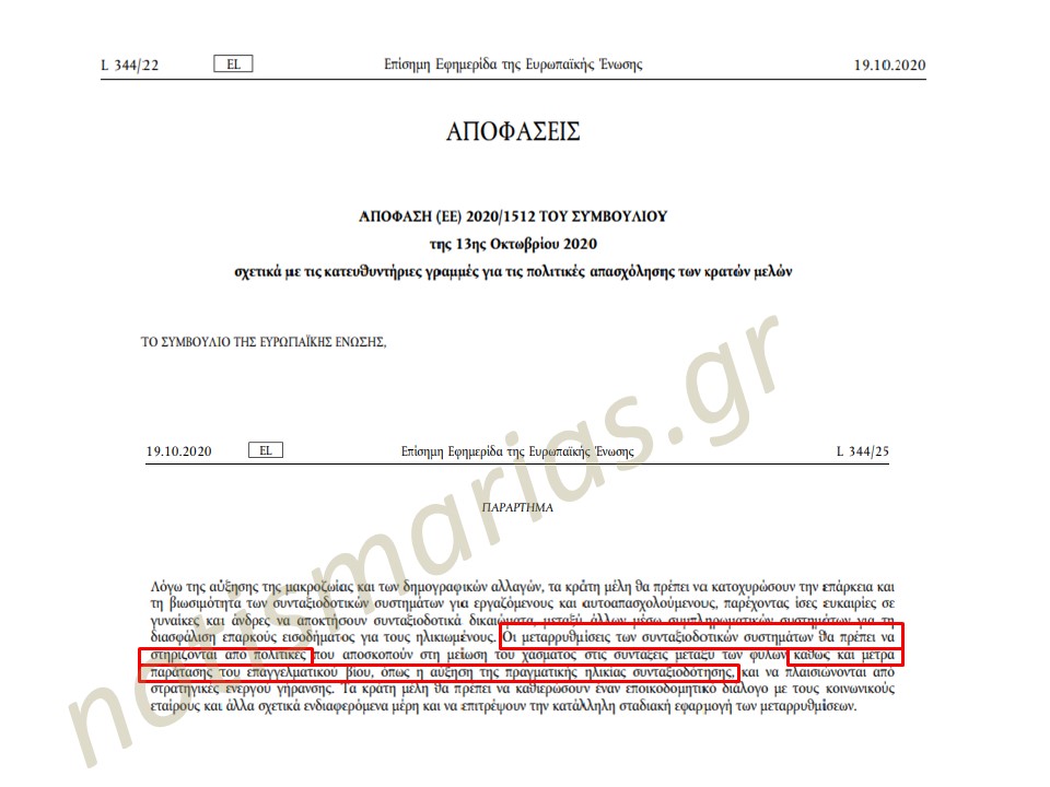 Στο πλαίσιο των κατευθυντήριων γραμμών της παραπάνω Απόφασης 2020/1512 του Συμβουλίου της ΕΕ σημαντικό ρόλο παίζει και η Κατευθυντήρια γραμμή 8 η οποία πέραν των άλλων προβλέπει ότι «λόγω της αύξησης της μακροζωίας και των δημογραφικών αλλαγών, τα κράτη μέλη θα πρέπει να κατοχυρώσουν την επάρκεια και τη βιωσιμότητα των συνταξιοδοτικών συστημάτων για εργαζόμενους και αυτοαπασχολούμενους, παρέχοντας ίσες ευκαιρίες σε γυναίκες και άνδρες να αποκτήσουν συνταξιοδοτικά δικαιώματα, μεταξύ άλλων μέσω συμπληρωματικών συστημάτων για τη διασφάλιση επαρκούς εισοδήματος για τους ηλικιωμένους. Οι μεταρρυθμίσεις των συνταξιοδοτικών συστημάτων θα πρέπει να στηρίζονται από πολιτικές που αποσκοπούν στη μείωση του χάσματος στις συντάξεις μεταξύ των φύλων καθώς και μέτρα παράτασης του επαγγελματικού βίου, όπως η αύξηση της πραγματικής ηλικίας συνταξιοδότησης, και να πλαισιώνονται από στρατηγικές ενεργού γήρανσης. Τα κράτη μέλη θα πρέπει να καθιερώσουν έναν εποικοδομητικό διάλογο με τους κοινωνικούς εταίρους και άλλα σχετικά ενδιαφερόμενα μέρη και να επιτρέψουν την κατάλληλη σταδιακή εφαρμογή των μεταρρυθμίσεων».