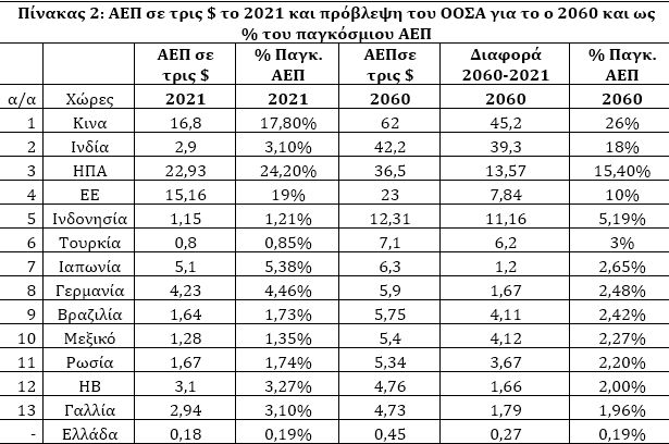 Στον πίνακα 2, παρουσιάζεται πως η «μετανάστευση» του πλούτου θα γιγαντώσει τις Ασιατικές χώρες. Σύμφωνα με τον ΟΟΣΑ το 2060, το παγκόσμιο ΑΕΠ θα είναι $237 τρις (από 95 το 2021). Στον πίνακα παρουσιάζεται η κατάταξη των χωρών ανάλογα με το ονομαστικό ΑΕΠ του 2060 σε τρις $. Η Κίνα θα είναι πρώτη με ΑΕΠ $62 τρις δηλαδή $45,2 τρις περισσότερα από σήμερα. Ως ποσοστό επί του παγκόσμιου ΑΕΠ θα ανέλθει από το 17,80% στο 26%. Δεύτερη η Ινδία $42,2 τρις, δηλαδή $39,3 τρις περισσότερα από σήμερα. Ως ποσοστό επί του παγκόσμιου ΑΕΠ θα εξαπλασιαστεί από το 3,10% στο 18%. Οι ΗΠΑ με ΑΕΠ $36,5 και η ΕΕ $23 τρις, αθροιστικά δεν θα φθάσουν το ΑΕΠ της Κίνας.