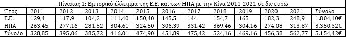 Τα τελευταία 11 έτη, η Ε.Ε. έχει απώλειες από το εμπορικό έλλειμα μόνο με την Κίνα €1,8 τρις και οι ΗΠΑ €3,35 τρις, συνολικά πάνω από $5 τρις. Το έλλειμα το 2021 ήταν 562,77 δις το υψηλότερο από ποτέ. Εάν τα επόμενα 10 έτη συνεχιστεί αυτό το έλλειμα οι δυο μεγαλύτερες οικονομίες του πλανήτη ΗΠΑ και ΕΕ θα απωλέσουν ακόμα αλλά 5 τρις. Στις επόμενες 4 δεκαετίες ο πλούτος που θα «μεταναστεύσει» μόνο προς την Κίνα μέσω των εμπορικών ελλειμάτων θα είναι περίπου $20 τρις!