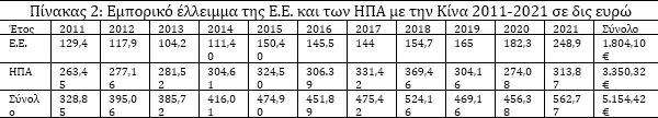 Σύμφωνα με τον πίνακα τα τελευταία 11 έτη, η Ε.Ε. έχει απώλειες από το εμπορικό έλλειμα μόνο με την Κίνα €1,8 τρις και οι ΗΠΑ €3,35 τρις. Το έλλειμα το 2021 ήταν €562,77 δις το υψηλότερο από ποτέ. Εάν τις επόμενες 4 δεκαετίες συνεχιστεί αυτό το έλλειμα οι δυο μεγαλύτερες οικονομίες του πλανήτη ΗΠΑ και ΕΕ θα απωλέσουν ακόμα αλλά €20 τρις! Τα ποσά αυτά θα γίνουν μεγαλύτερα εάν θα διευρυνθούν τα ετήσια ελλείματα.