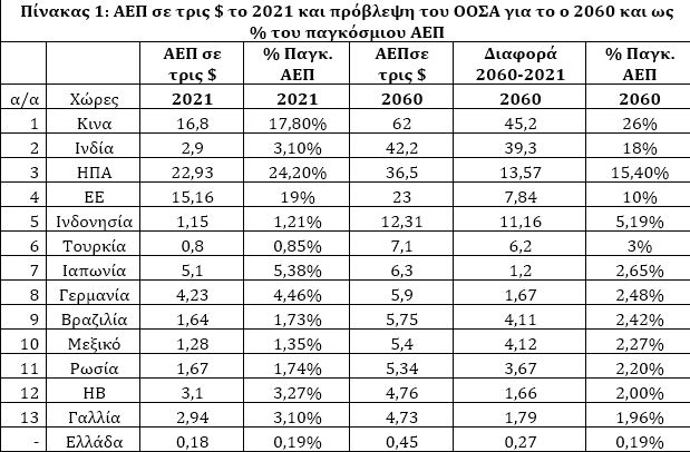 Στον πίνακα 1, παρουσιάζεται πως μετατοπίζεται το παγκόσμιο οικονομικό κέντρο προς τις Ασιατικές χώρες. Σύμφωνα με τον ΟΟΣΑ το 2060, το παγκόσμιο ΑΕΠ θα είναι $237 τρις (από 95 το 2021). Στον πίνακα παρουσιάζεται η κατάταξη των χωρών ανάλογα με το ονομαστικό ΑΕΠ του 2060 σε τρις $. Η Κίνα θα είναι πρώτη με ΑΕΠ $62 τρις δηλαδή $45,2 τρις περισσότερα από σήμερα. Ως ποσοστό επί του παγκόσμιου ΑΕΠ θα ανέλθει από το 17,80% στο 26%. Δεύτερη η Ινδία $42,2 τρις, δηλαδή $39,3 τρις περισσότερα από σήμερα. Ως ποσοστό επί του παγκόσμιου ΑΕΠ θα εξαπλασιαστεί από το 3,10% στο 18%. Οι ΗΠΑ με ΑΕΠ $36,5 και η ΕΕ $23 τρις, αθροιστικά δεν θα φθάσουν το ΑΕΠ της Κίνας.