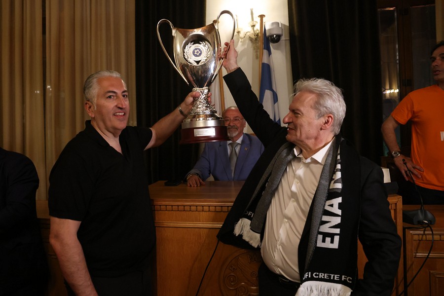 Μέσα σε πανηγυρικό κλίμα, έντονο ενθουσιασμό, χαρά και συγκίνηση, ο Δήμαρχος Ηρακλείου Αλέξης Καλοκαιρινός και το Δημοτικό Συμβούλιο υποδέχτηκαν στη Λότζια τους παίκτες, τον προπονητή, τη διοίκηση του κυπελλούχου ΟΦΗ, καθώς και τους χιλιάδες φιλάθλους που τους συνόδευαν στην πορεία θριάμβου στους κεντρικούς δρόμους της πόλης.