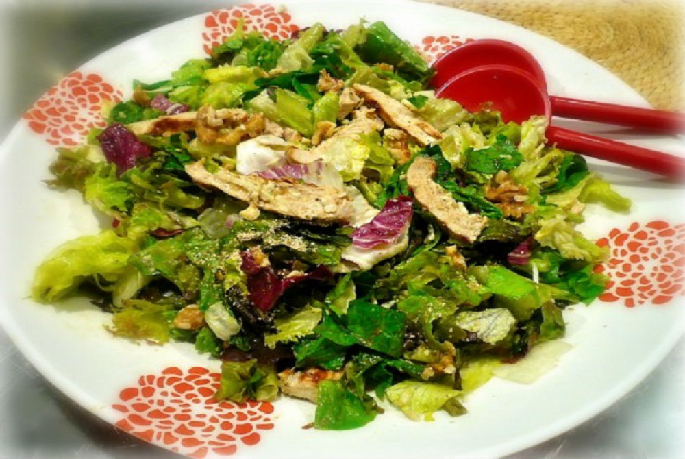 Βάζετε τα σαλατικά σε μπολ, προσθέτετε τις λωρίδες κοτόπουλου, το κεφαλοτύρι και τα καρύδια. Ρίχνετε τη βινεγκρέτ και ανακατεύετε καλά πολλές φορές .