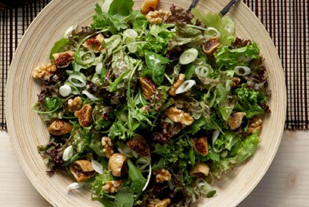 Στο μεταξύ χοντροκόβουμε με το χέρι τις πρασινάδες και τις βάζουμε σε ένα μεγάλο μπολ. Προσθέτουμε τα μυρωδικά και το φρέσκο κρεμμυδάκι και ανακατεύουμε. Στραγγίζουμε τα σύκα (κρατάμε το χυμό για τη σάλτσα) και βάζουμε τα μισά στο μπολ με τα σαλατικά. Προσθέτουμε και τους μισούς ξηρούς καρπούς και ανακατεύουμε.