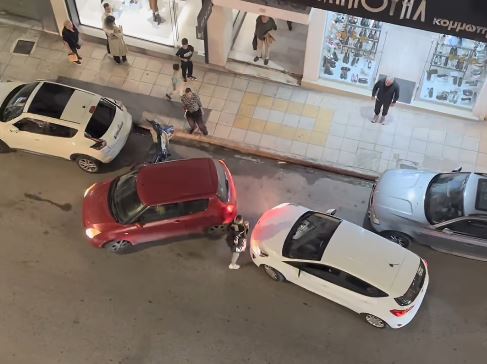 Από τη μια οδηγός με το κόκκινο αυτοκίνητο, από την άλλη γυναίκα που προσπαθούσε να κρατήσει τη θέση για το λευκό αυτοκίνητο, μανούβρες εκατέρωθεν και φωνές, κι όλα αυτά για δύο μέτρα ασφάλτου.