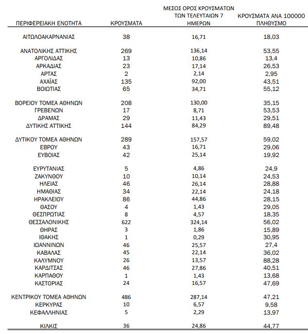 Σε πανελλαδικό επίπεδο, ο “χάρτης” των κρουσμάτων έχει ως εξής: