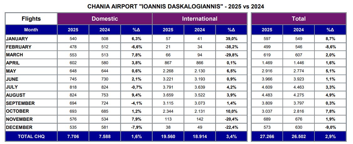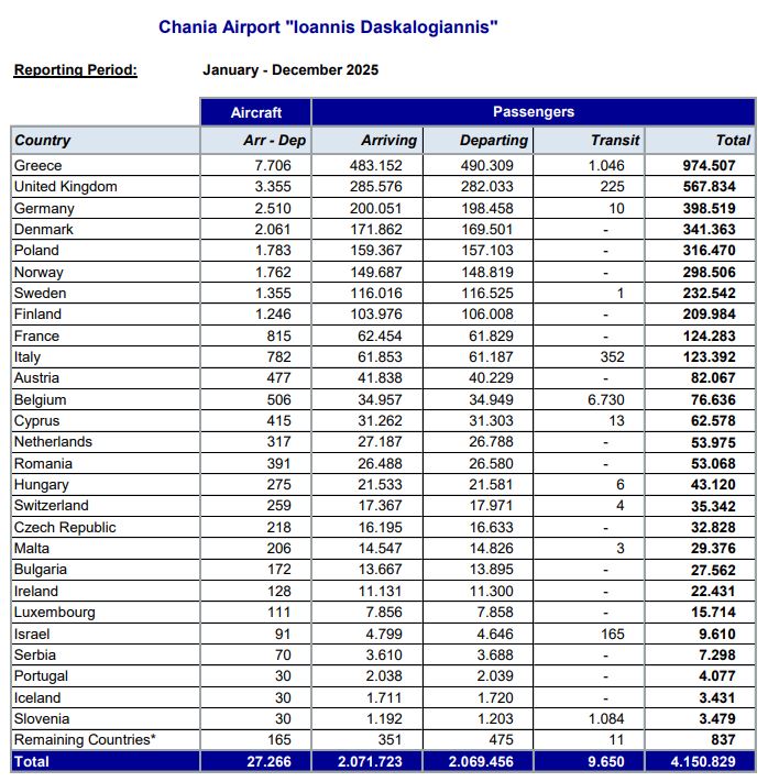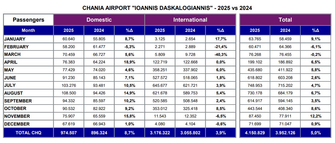 Με ρεκόρ κίνησης έκλεισε το 2025 στο αεροδρόμιο Χανίων, καθώς το έτος που πέρασε διακινήθηκαν από τον αερολιμένα συνολικά 4.150.829 επιβάτες.