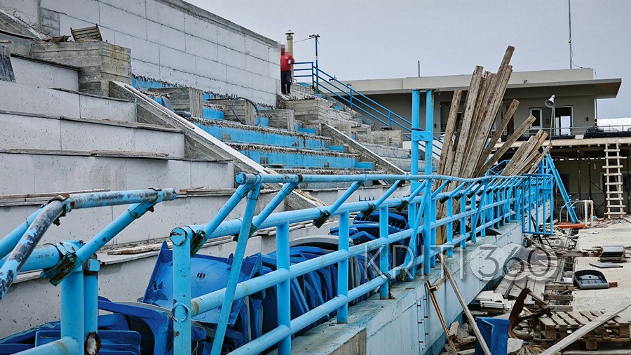 Συνεργείο του αναδόχου έριχνε μπετόν στον περιβάλλοντα χώρο πίσω από την εξέδρα ενώ και στον χώρο της πισίνας και της εξέδρας γίνονταν κάποιες εργασίες.