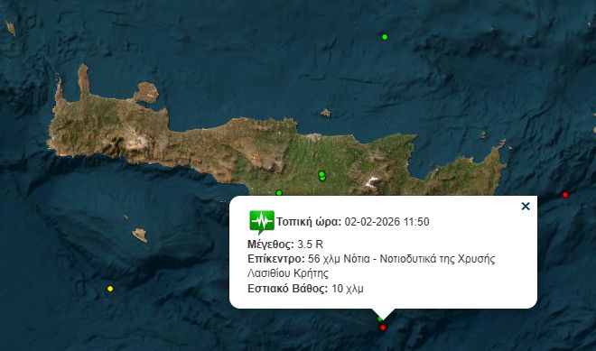 Σεισμική δόνηση μεγέθους 3,5 βαθμών της κλίμακας Ρίχτερ καταγράφηκε σήμερα, Δευτέρα 2 Φεβρουαρίου 2026, στις 11:50, στη θαλάσσια περιοχή νότια της Κρήτης.