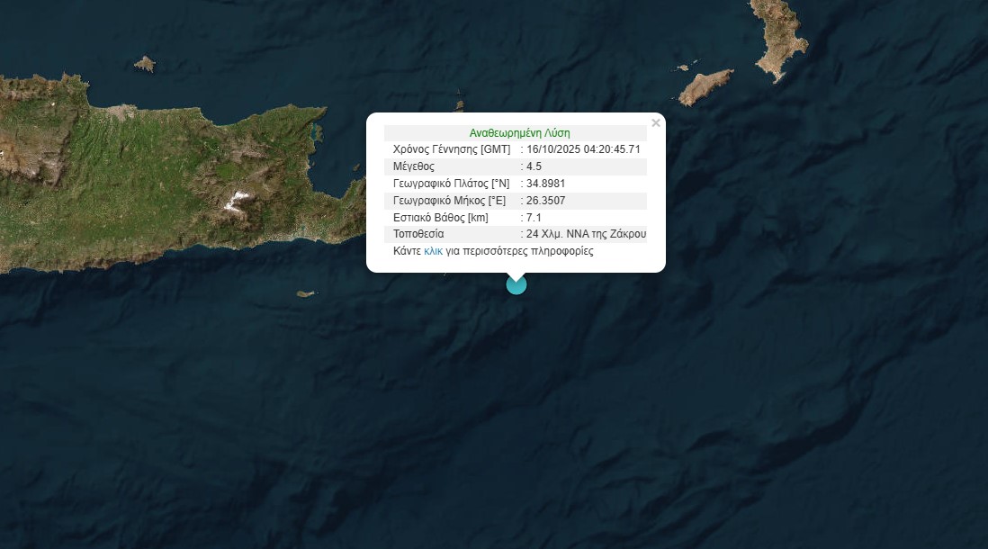 Σεισμός μεγέθους 4,5 της κλίμακας Ρίχτερ, σημειώθηκε το πρωί της Πέμπτης (16/10) στις 07:20, ανοικτά της Κρήτης.