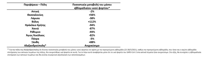Πίνακας 1: Ποσοστιαία μεταβολή στη μέση εβδομαδιαία συγκέντρωση του ιικού φορτίου του SARS-CoV-2 στα αστικά λύματα ανά 100.000 κατοίκους την εβδομάδα 29 Μαρτίου – 4 Απριλίου 2021 σε σχέση με την εβδομάδα 22-28 Μαρτίου 2021