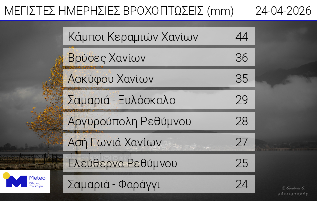 Οι εντονότερες βροχοπτώσεις σε όλη τη χώρα σημειώθηκαν την Παρασκευή σε περιοχές των Χανίων και του Ρεθύμνου.