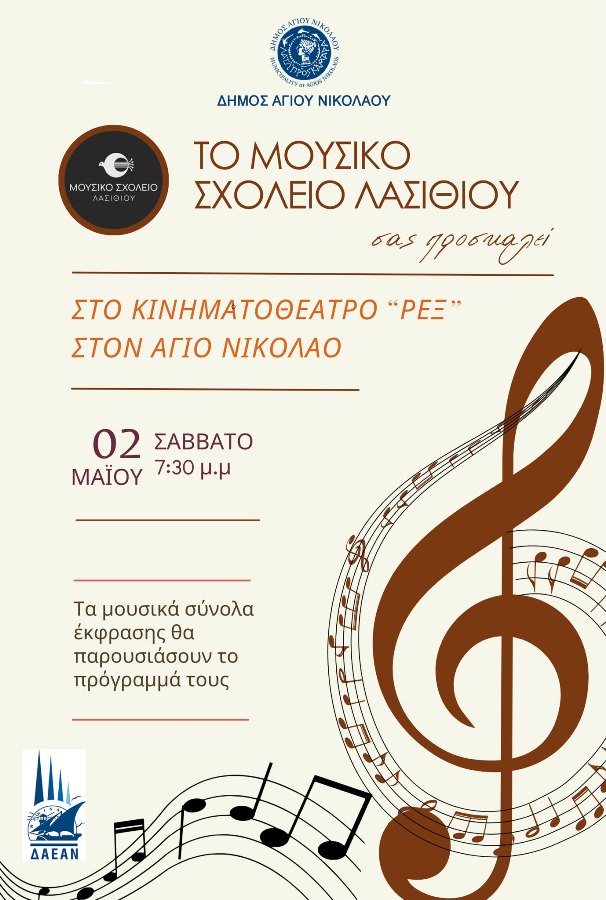 Μια ξεχωριστή συναυλία του Μουσικού Σχολείου Λασιθίου θα πραγματοποιηθεί, υπό την αιγίδα του Δήμου Αγίου Νικολάου και της Δημοτικής Ανώνυμης Εταιρείας Αγίου Νικολάου (Δ.Α.Ε.Α.Ν.), το Σάββατο 2 Μαΐου 2026 και ώρα 19:30, στο Κινηματοθέατρο REX, στον Άγιο Νικόλαο.