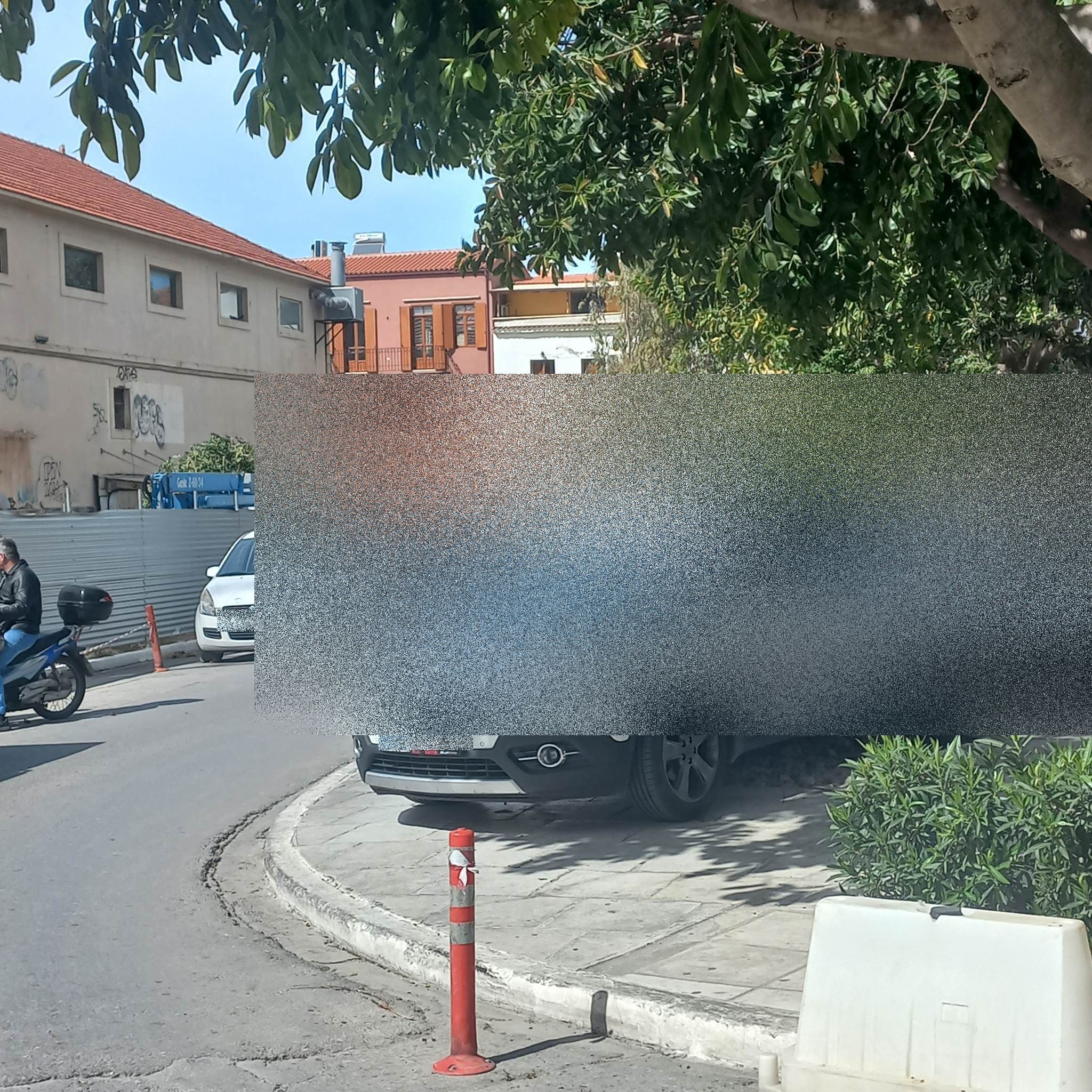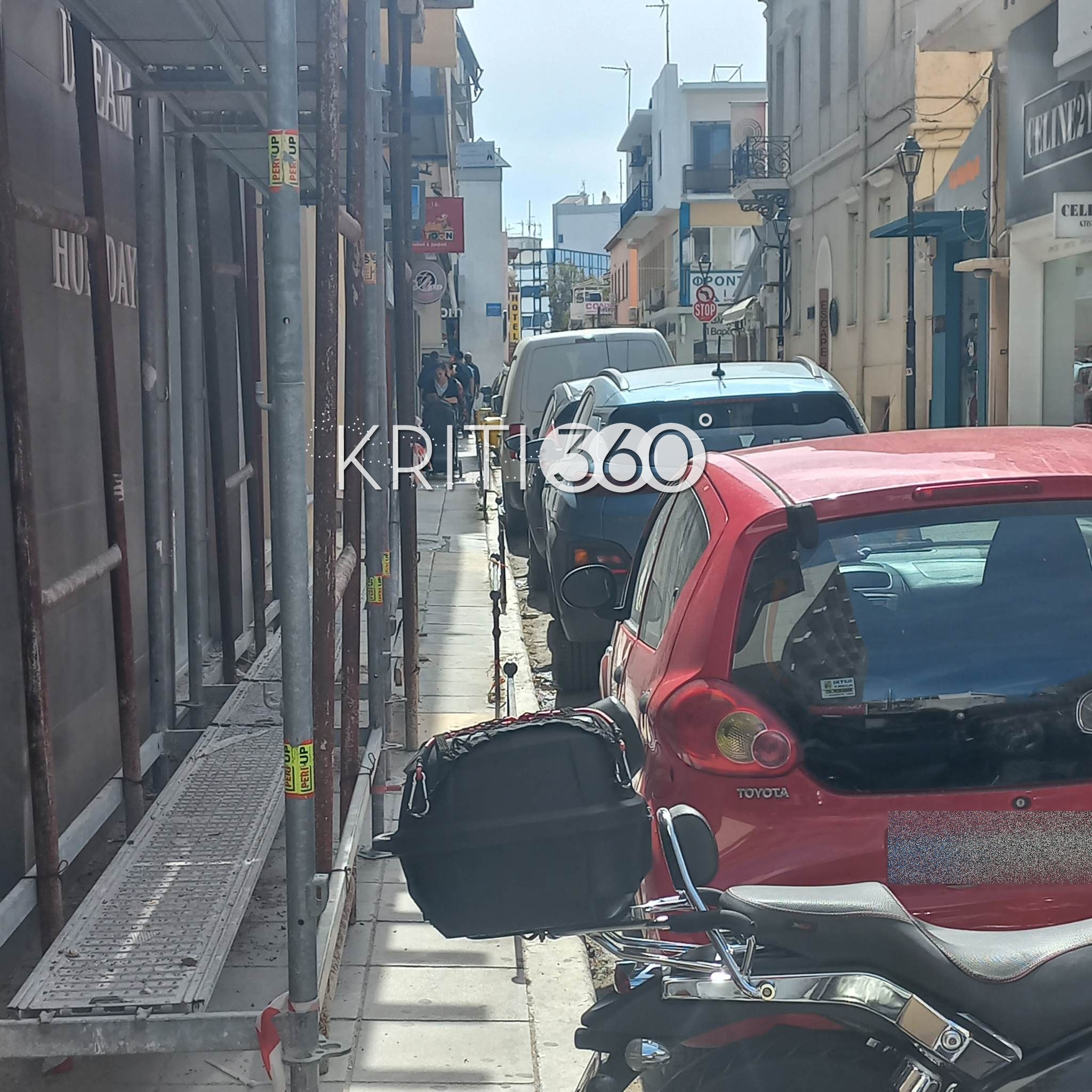 Η πρώτη στην Κτιστάκη όπου από την μια οι σκαλωσιές και από την άλλη μια μοτοσικλέτα έκλεισαν εντελώς το πεζοδρόμιο: