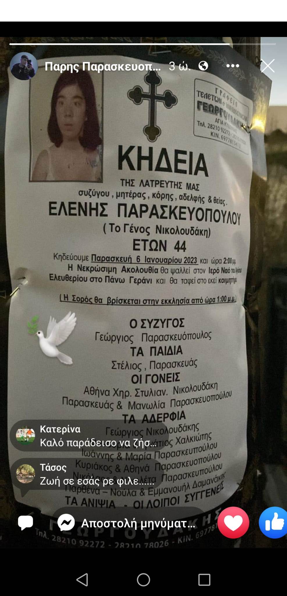Η 44χρονη, ήταν μητέρα του ποδοσφαιριστή Πάρη Παρασκευόπουλου της Αθλητικής Ένωσης Κυδωνίας και η κηδεία της θα γίνει την Παρασκευή, στις 2 το μεσημέρι στον ιερό ναό του Αγίου Ελευθερίου, στο Πάνω Γεράνι.