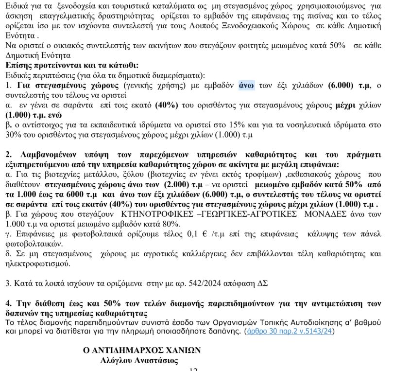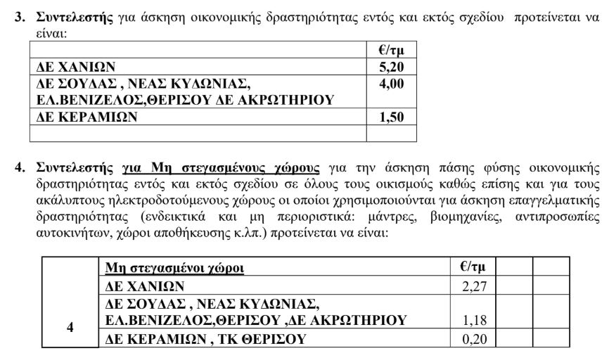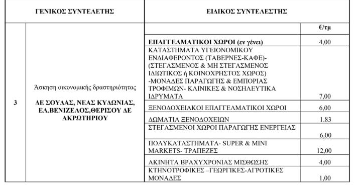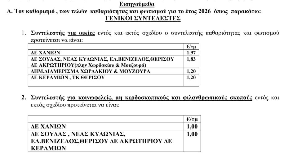 Ο γενικός συντελεστής στη δημοτική ενότητα Χανίων παραμένει στα 5,20 ευρώ ανά τ.μ., στις υπόλοιπες ενότητες 4 ευρώ, εκτός από τα Κεραμειά όπου είναι 1,50 ευρώ ανά τ.μ.