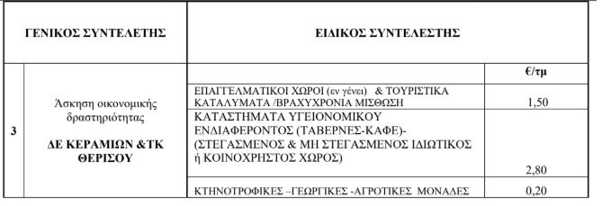 Οι ειδικοί συντελεστές αφορούν περιπτώσεις τουριστικών καταλυμάτων, καταστημάτων υγειονομικού ενδιαφέροντος, σουπερμάρκετ και τραπεζών, ενώ διαφοροποίηση υπάρχει και στις περιοχές όπου λειτουργεί το σύστημα αποκομιδής “πόρτα-πόρτα”, καθώς το κόστος της υπηρεσίας αυτής είναι αυξημένο σε σχέση με την κλασική αποκομιδή.