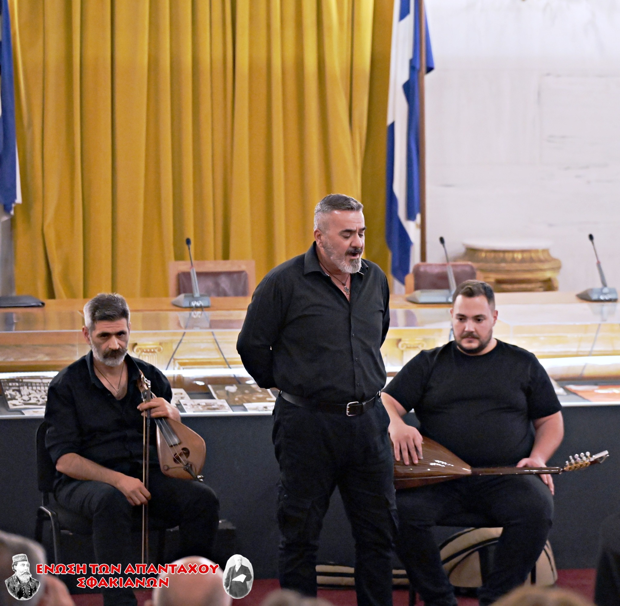 Επένδυσαν μουσικά τη βραδιά, ο Μιχάλης Πολυχρονάκης, με τη φωνή και τη λύρα του, ο Μανώλης Λουπασάκης, με το λαούτο, κι ο Νεκτάριος Μπούχλης, που απέδωσε με το δικό του ξεχωριστό τρόπο, ριζίτικο αφιερωμένο στον Ξενουδάκη,