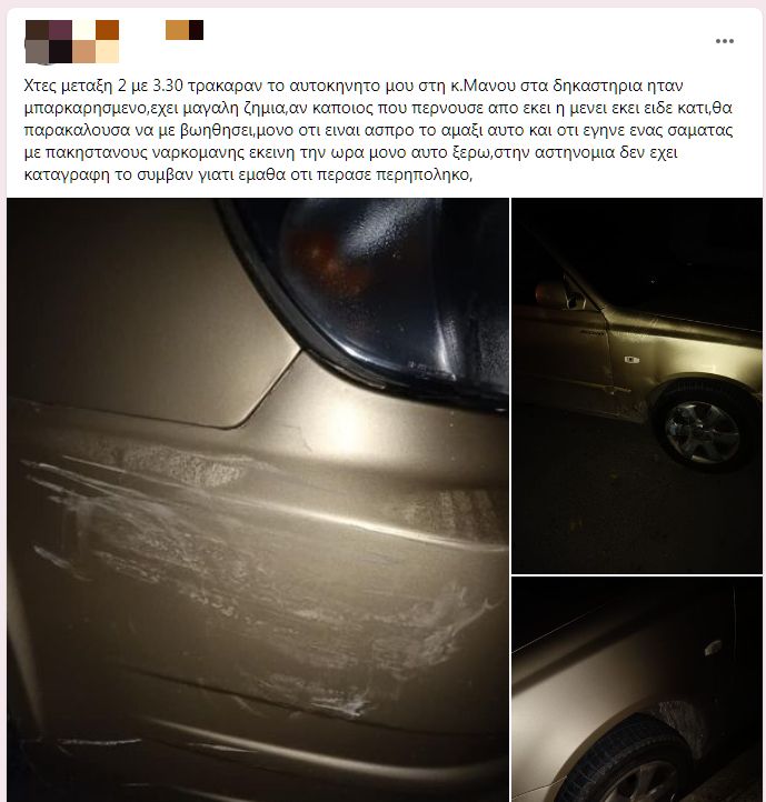 Το περιστατικό σημειώθηκε στην οδό Κ.Μάνου στην περιοχή των Δικαστηρίων όπου ήταν σταθμευμένου το ΙΧ. Αγνωστοι και υπό άγνωστες συνθήκες προκάλεσαν ζημιές στο όχημα και τώρα η γυναίκα αναζητά τα άτομα που είναι υπεύθυνα για την ζημιά