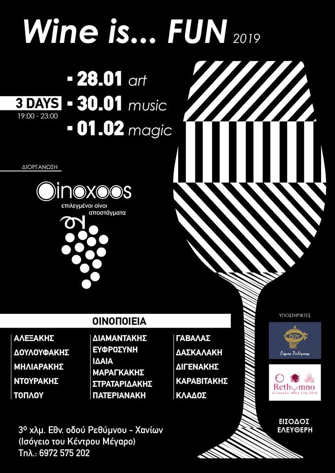 Για τρεις μέρες, την επόμενη εβδομάδα, στον όμορφο χώρο της κάβας Οινοχόος, παρουσιάζεται η παραγωγή 16 διακεκριμένων κρητικών οινοποιείων. Τη Δευτέρα 28 Ιανουαρίου, την Τετάρτη 30 Ιανουαρίου και την Παρασκευή 2 Φεβρουαρίου 2019, από τις 19:00 έως τις 23:00, οινόφιλοι της πόλης, ερασιτέχνες και επαγγελματίες του κρασιού, καλούνται να γνωρίσουν και να δοκιμάσουν, εντελώς δωρεάν, εμφιαλωμένο, ποιοτικό, κρητικό κρασί. Παράλληλα, τις ίδιες ημέρες, μετά  τις οινικές δοκιμές, εξελίσσονται τρεις θεματικές που αφορούν την τέχνη, τη μουσική και τη μαγεία του κρασιού (21:00-23:00).