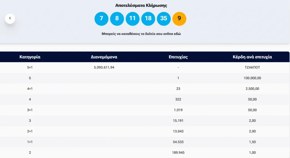 Οι τυχεροί αριθμοί της αποψινής κλήρωσης είναι οι εξής: 7, 8, 11, 18, 35 και Τζόκερ ο αριθμός 9.