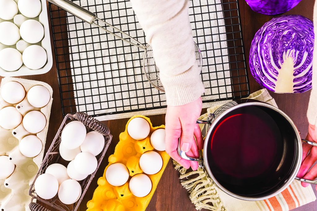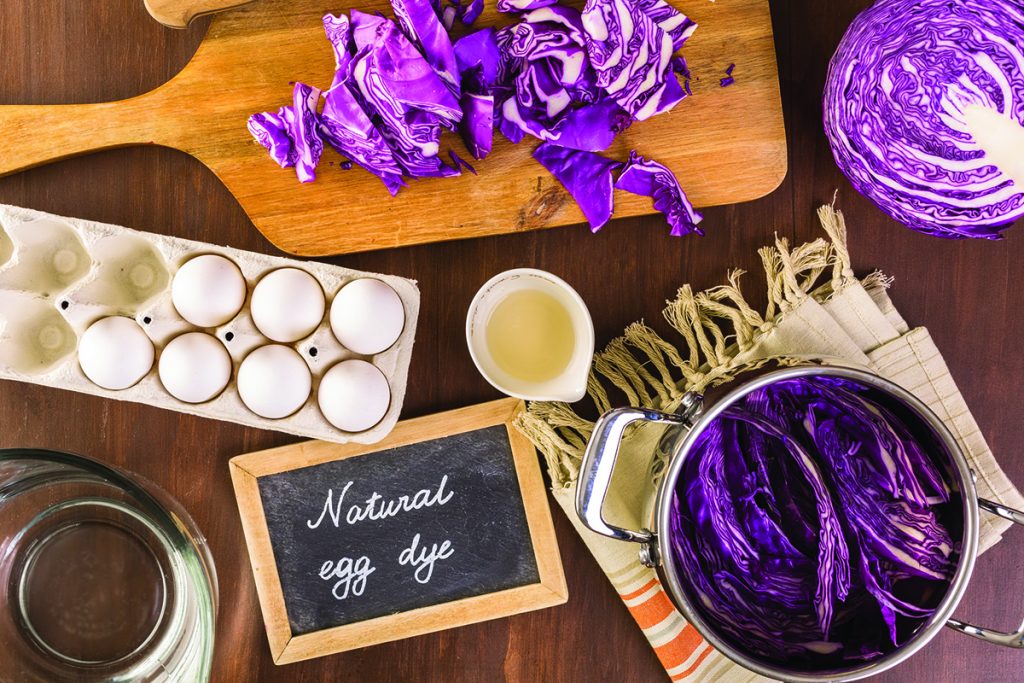 Χρησιμοποιήστε κόκκινο λάχανο ή παντζάρι, φλούδια από ξερά κόκκινα κρεμμύδια ή κουρκουμά. Να θυμάστε ότι το τελικό αποτέλεσμα δεν θα είναι πολύ έντονο, αλλά πιο απαλό, παστέλ. Επίσης, για να πετύχετε πιο ωραία χρώματα επιλέξτε λευκά αβγά που έχετε σιγοβράσει για τουλάχιστον 20΄ σε χαμηλή φωτιά. Εμείς εδώ πειραματιζόμαστε με κόκκινο λάχανο.