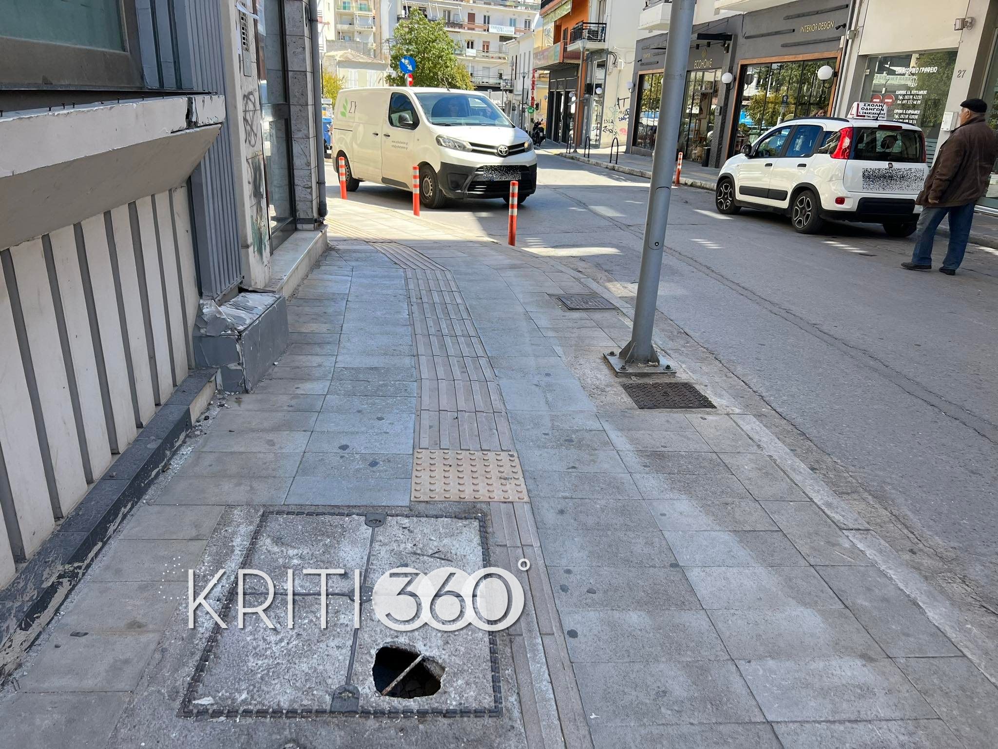 Η νέα παγίδα βρίσκεται στην συμβολή τω οδών Περίδου και Γρηγορίου Ε στην πλατεία Κολοκοτρώνη και όπως μπορείτε να διαπιστώσετε από τις φωτογραφίες που δημοσιεύει το kriti360.gr είναι αρκετά μεγάλη για να προκαλέσει σοβαρό τραυματισμό.