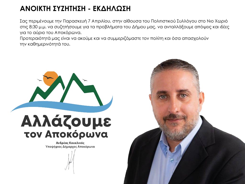 Ανοικτή συζήτηση με τους Δημότες του Αποκόρωνα, οργανώνει την Παρασκευή 07/04/2023, ο επικεφαλής της Παράταξης “Αλλάζουμε τον Αποκόρωνα” και Υποψήφιος Δήμαρχος Αποκορώνου, κ. Ανδρέας Κουκλινός