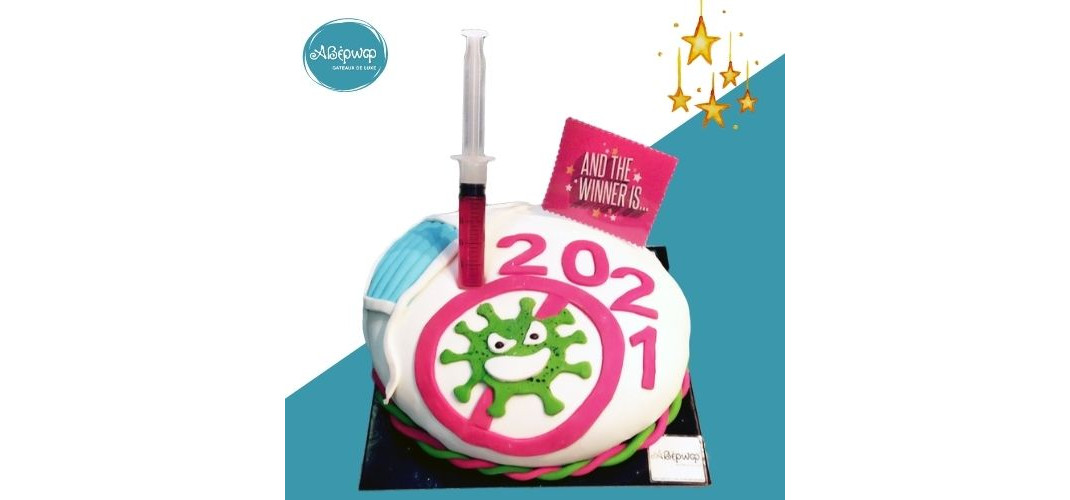 Η βασιλόπιτα κατά του κορωνοϊού, όπως την ονόμασε το ζαχαροπλαστείο, έχει πάνω της ένα «κακό» πράσινο στέλεχος του ιού με ένα Χ και καρφωμένο ένα εμβόλιο από φράουλα. Μάλιστα, έχει και μια μάσκα λίγο πιο δίπλα ενώ γράφει πάνω 2021.